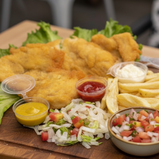 250g de papas a la francesa, 200 g costilla, 120 g pollo, 100 g chorizo, 100 g plátano maduro.