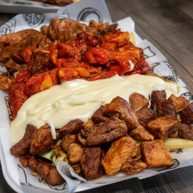 Deliciosa salchipapa trifasica para dos personas con chorizo, costilla en salsa BBQ, res y cerdo en un adobo especial de la casa, maiz y rico queso mozzarella