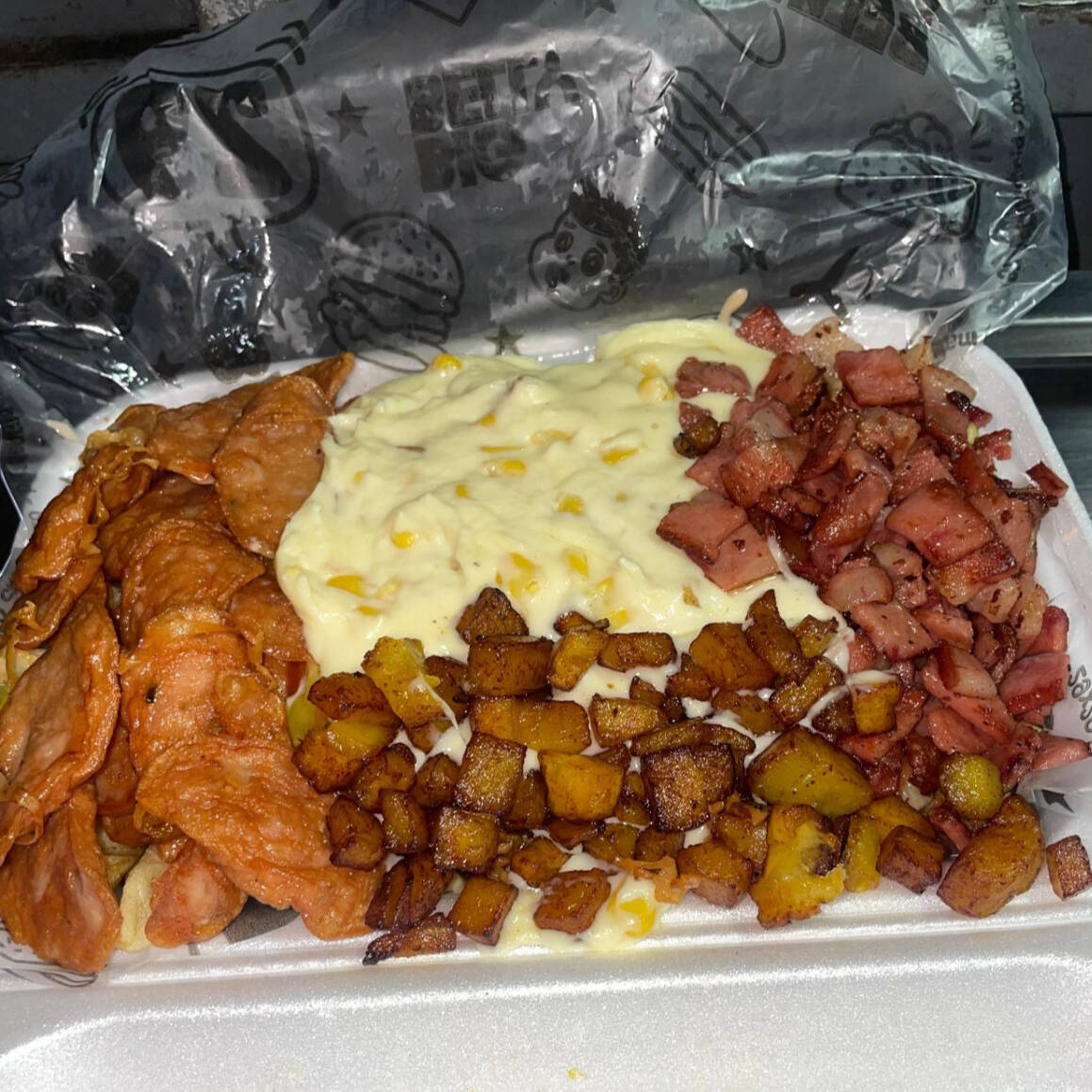 Papas a la francesa, tocineta, queso gratinado con maíz, chorizo y trozos de maduro