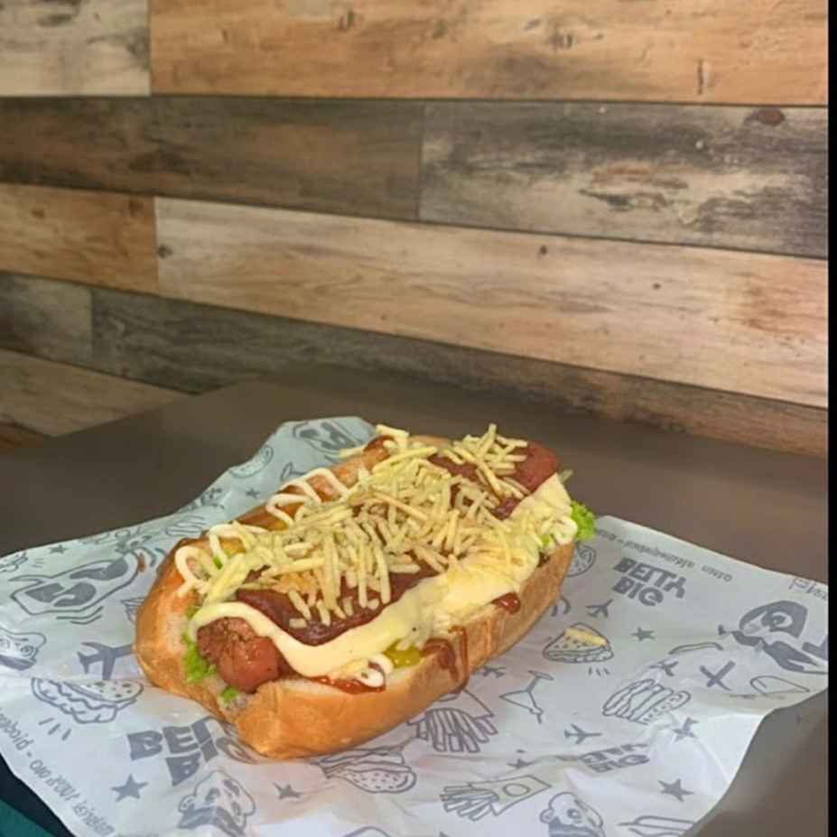 Pan perro, salchicha hot dog, cebolla caramelizada, 100 g queso gratinado, salsa rosada, salsa de tomate, salsa de ajo y salsa de piña a eleccion.