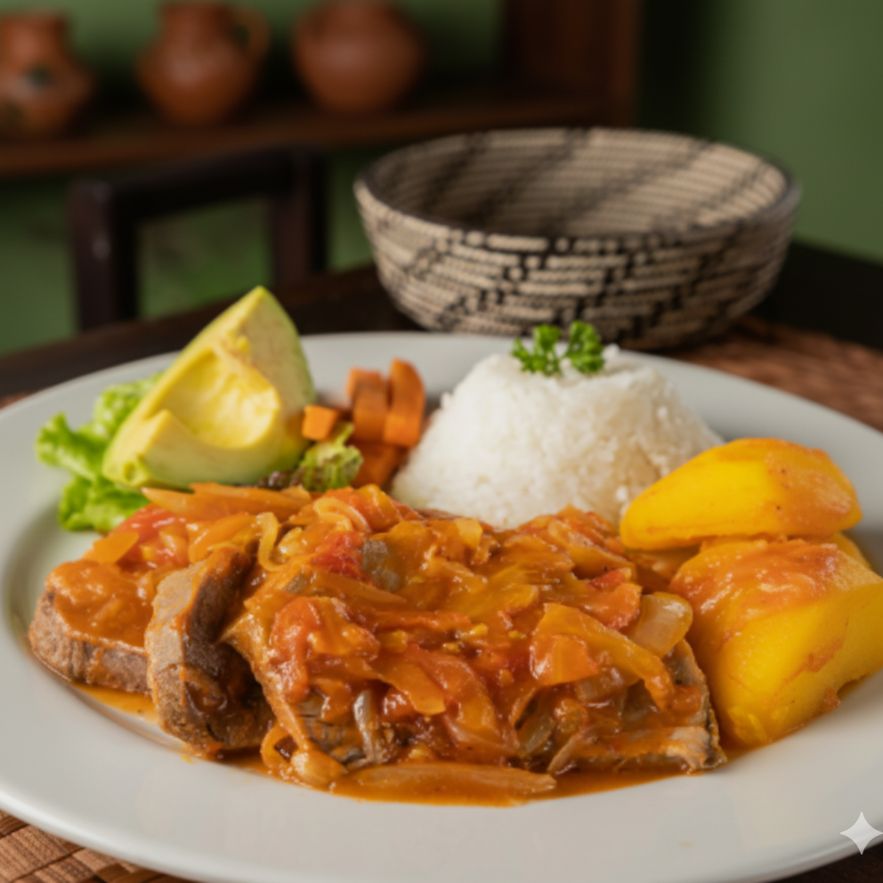 Acompañada de papa guisada, arroz, aguacate, maduro, ensalada de la casa, sopa del día.