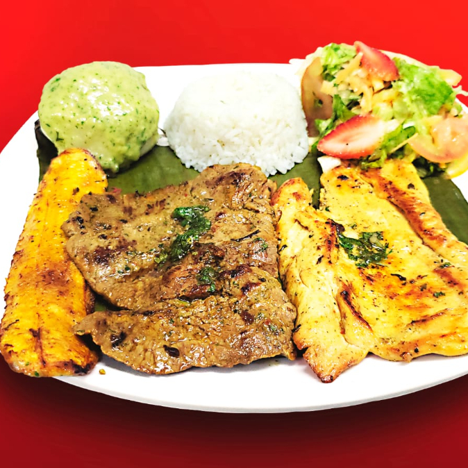 300 g En total, pollo, res, cerdo, papa con guacamole, arroz, maduro, ensalada de la casa.