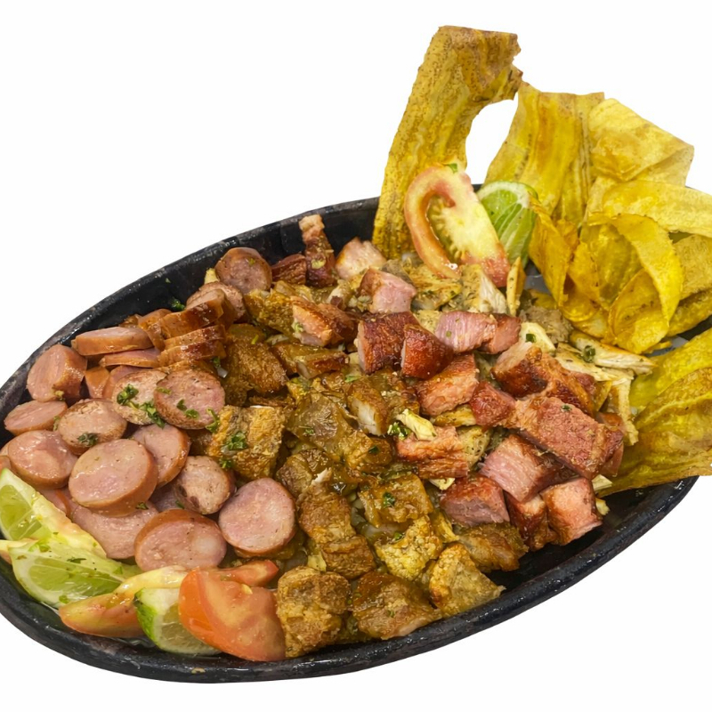 800 g De proteína aproximadamente, pollo, res, cerdo, chicharrón, costilla, chorizo, chips de plátano verde, papas a la francesa, tomate picado y limón.