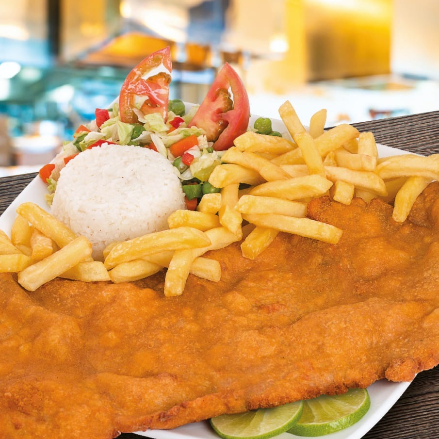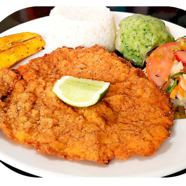 Acompañada de papas a la francesa, arroz, maduro, ensalada de la casa.