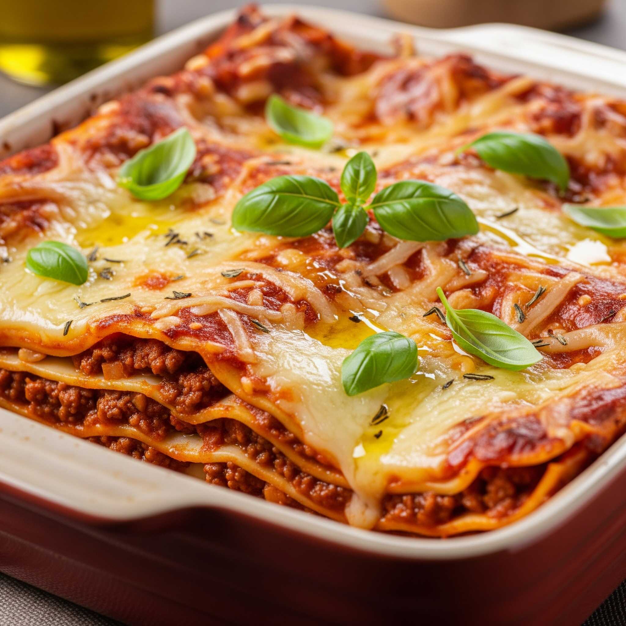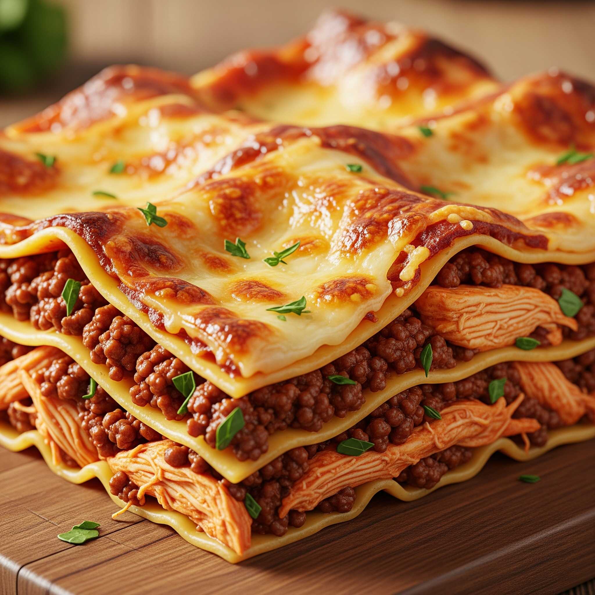 Deliciosa lasaña de pasta, pollo, carne, queso.