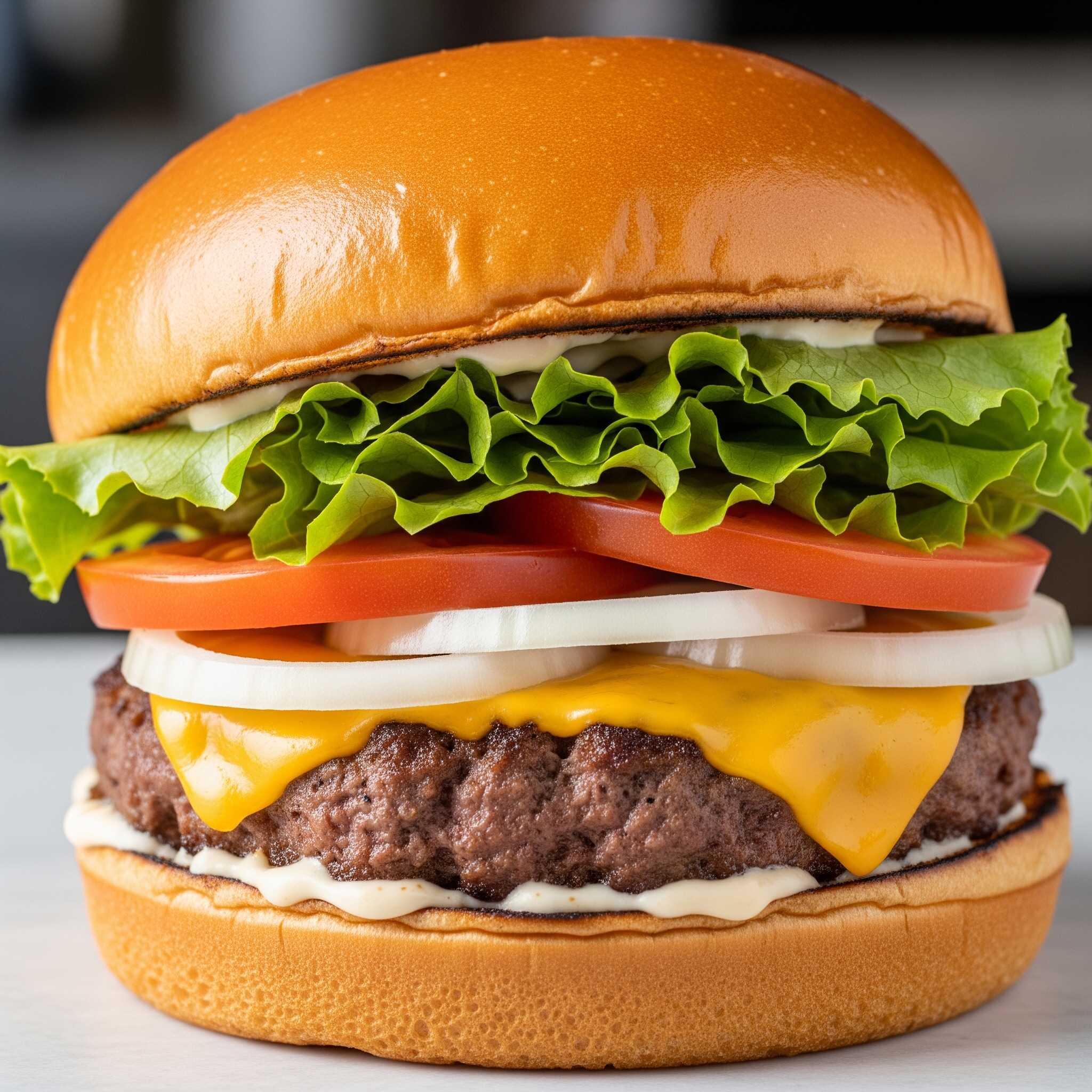 Pan, carne, lechuga, tomate, cebolla, salsa de la casa, ripio y queso.