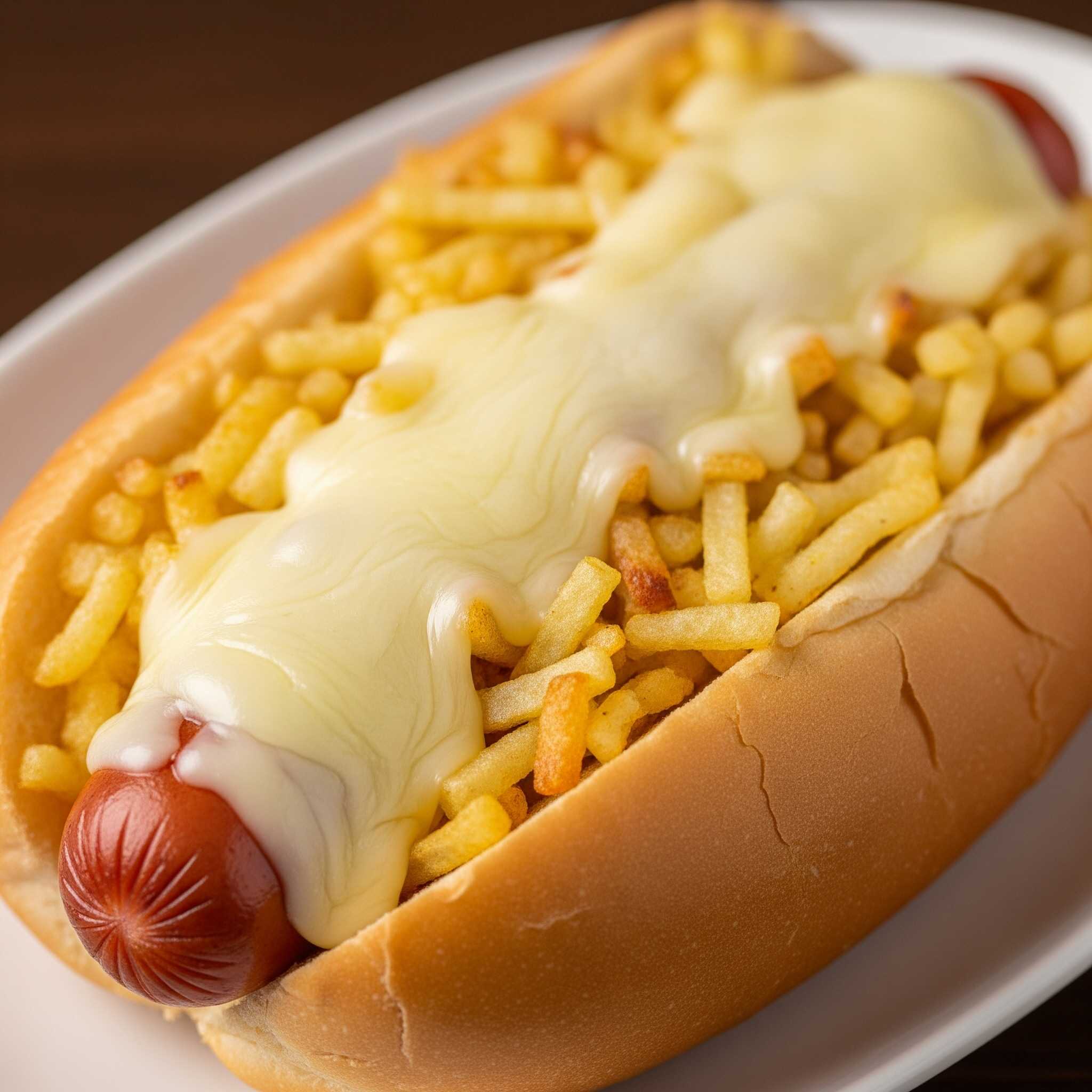Pan, salchicha, salsa de la casa, ripio y queso.