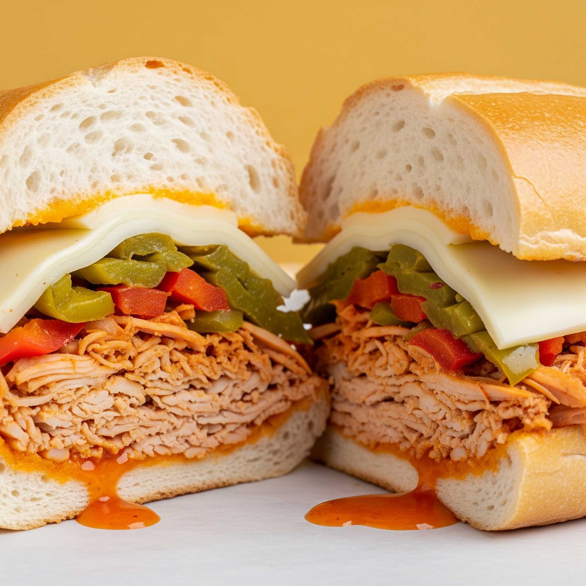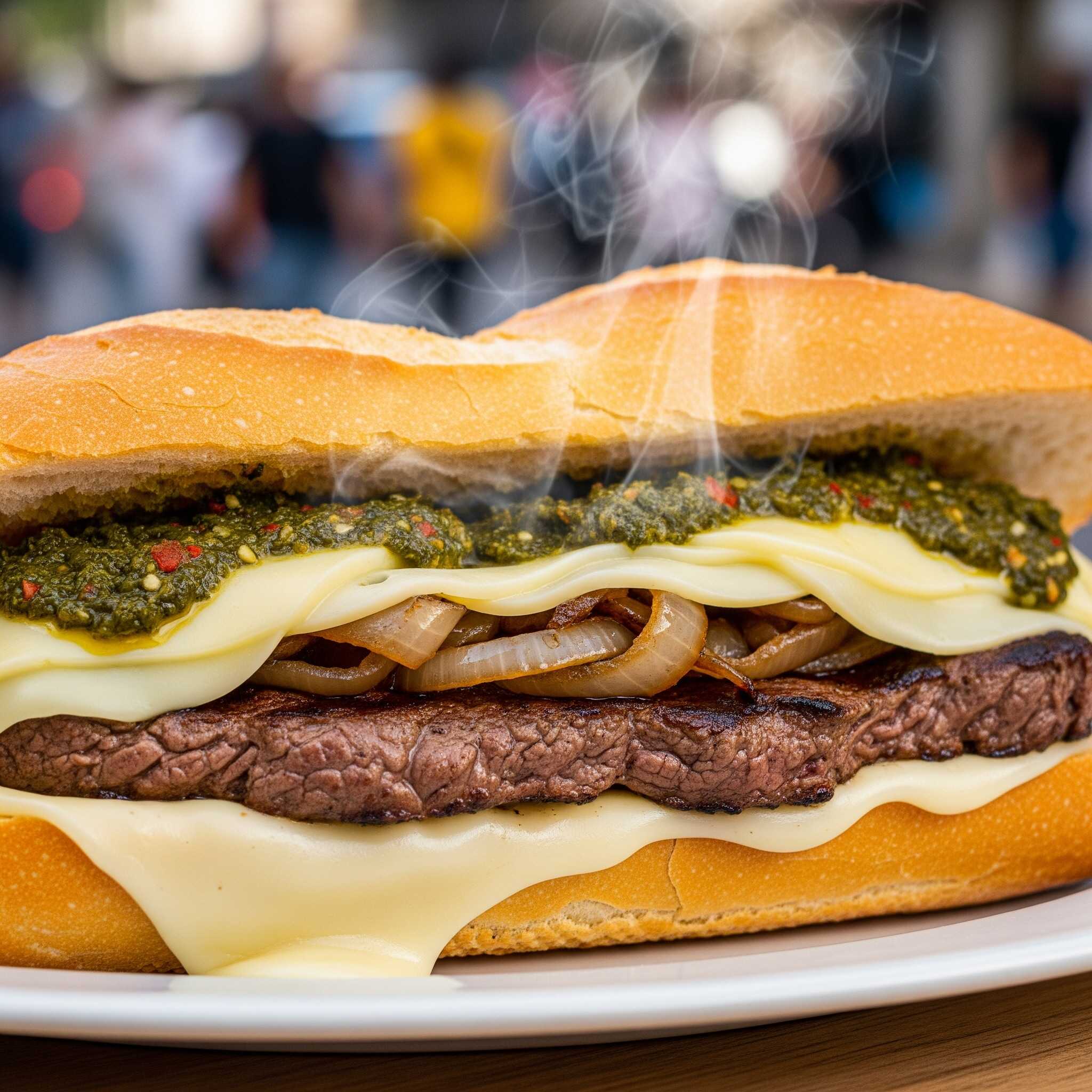 Pan, pollo, carne, queso, salsa de la casa y ripio.