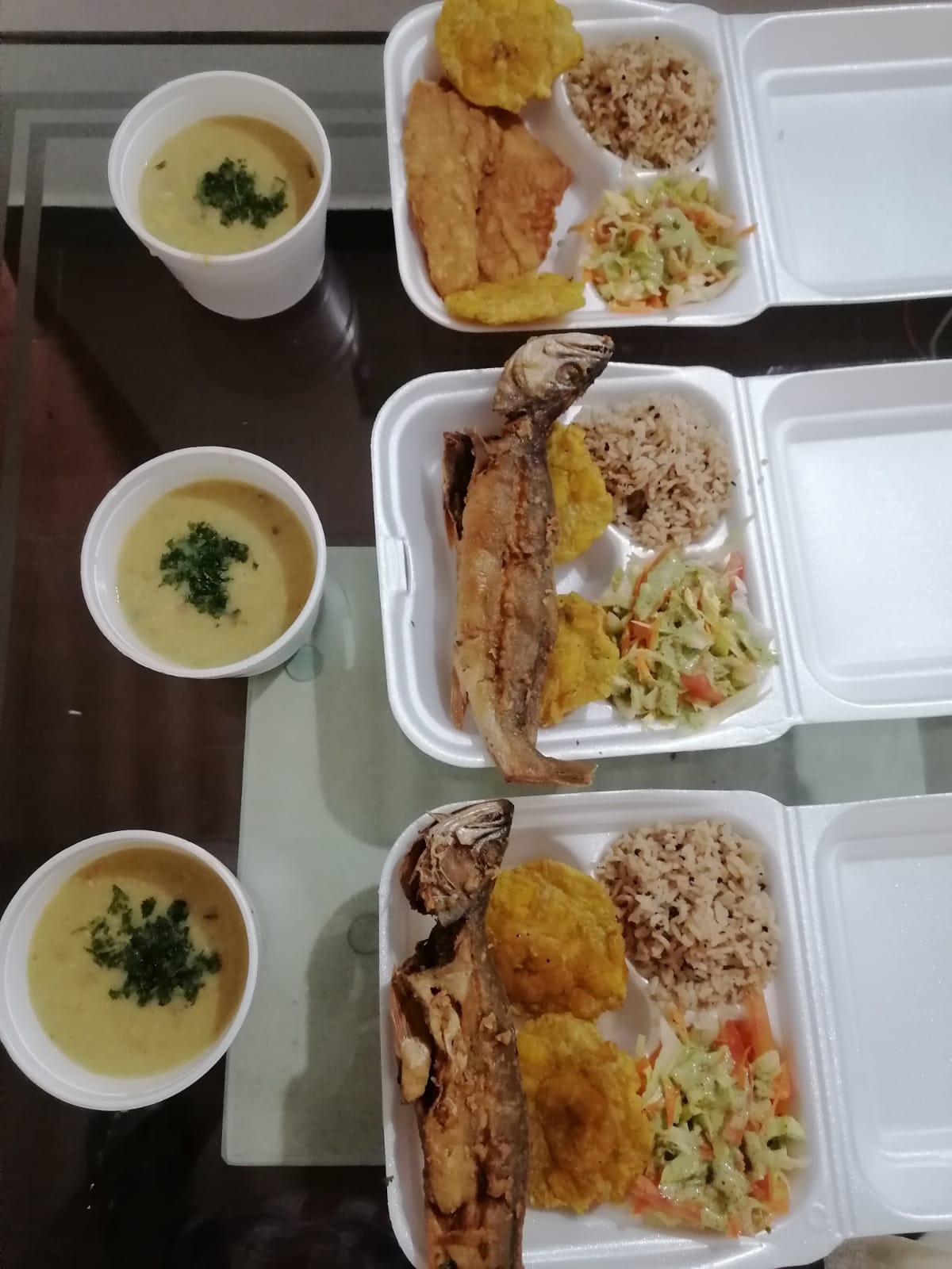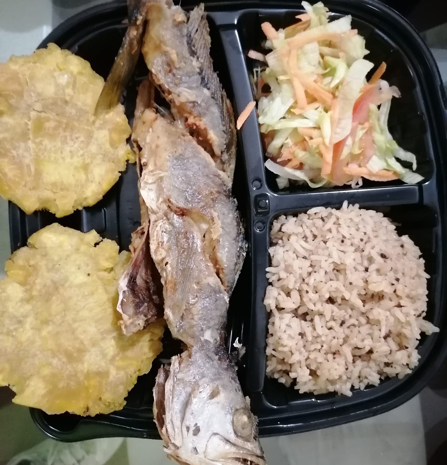 Pescado frito entero Arroz de coco o blanco Tostada de plátano Ensalada Jugo de maracuyá o de piña o lulo o agua de panela 2 empanadas de camarónes Y postre