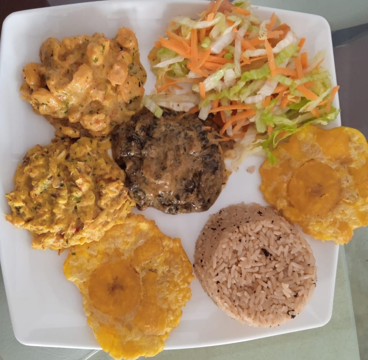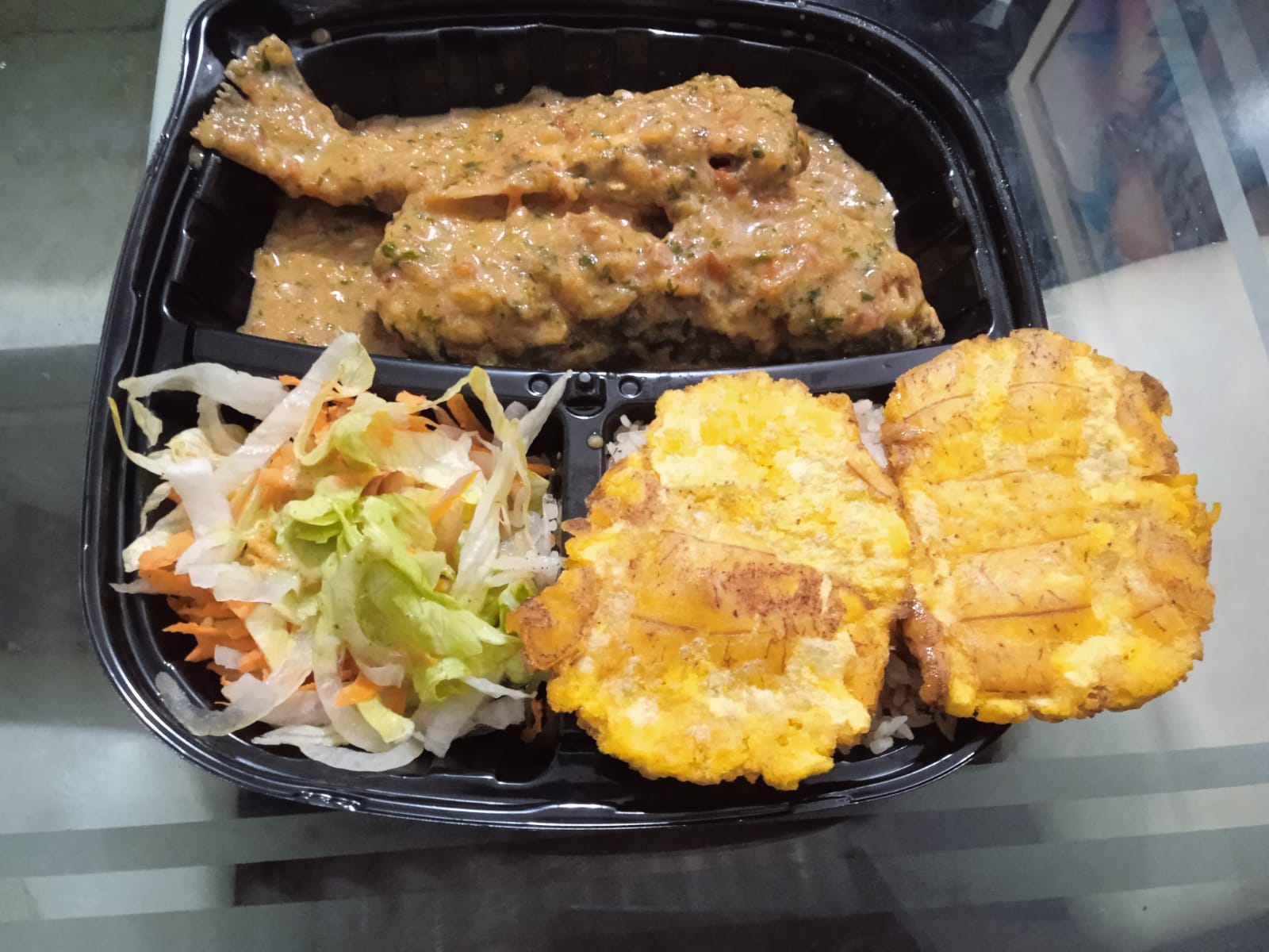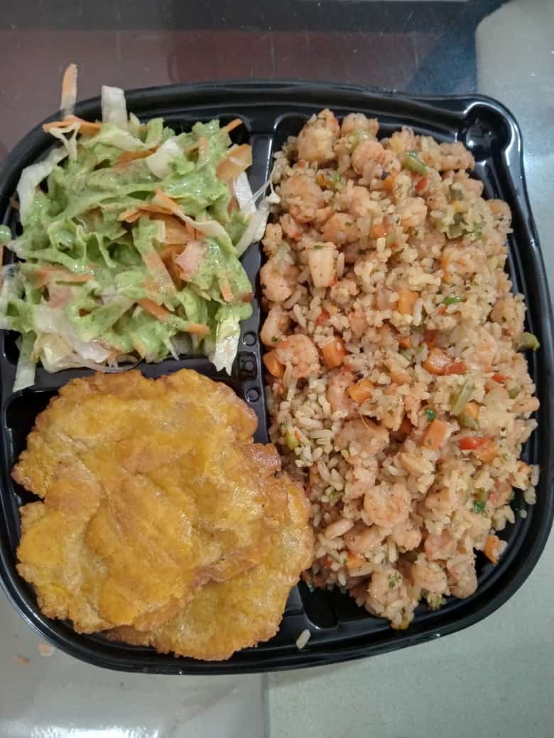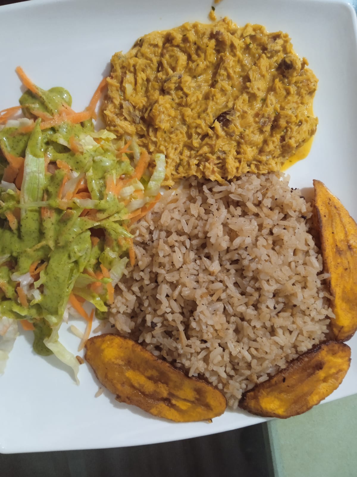 Acompañado de arroz de coco o blanco, ensalada, tostadas de plátanos.