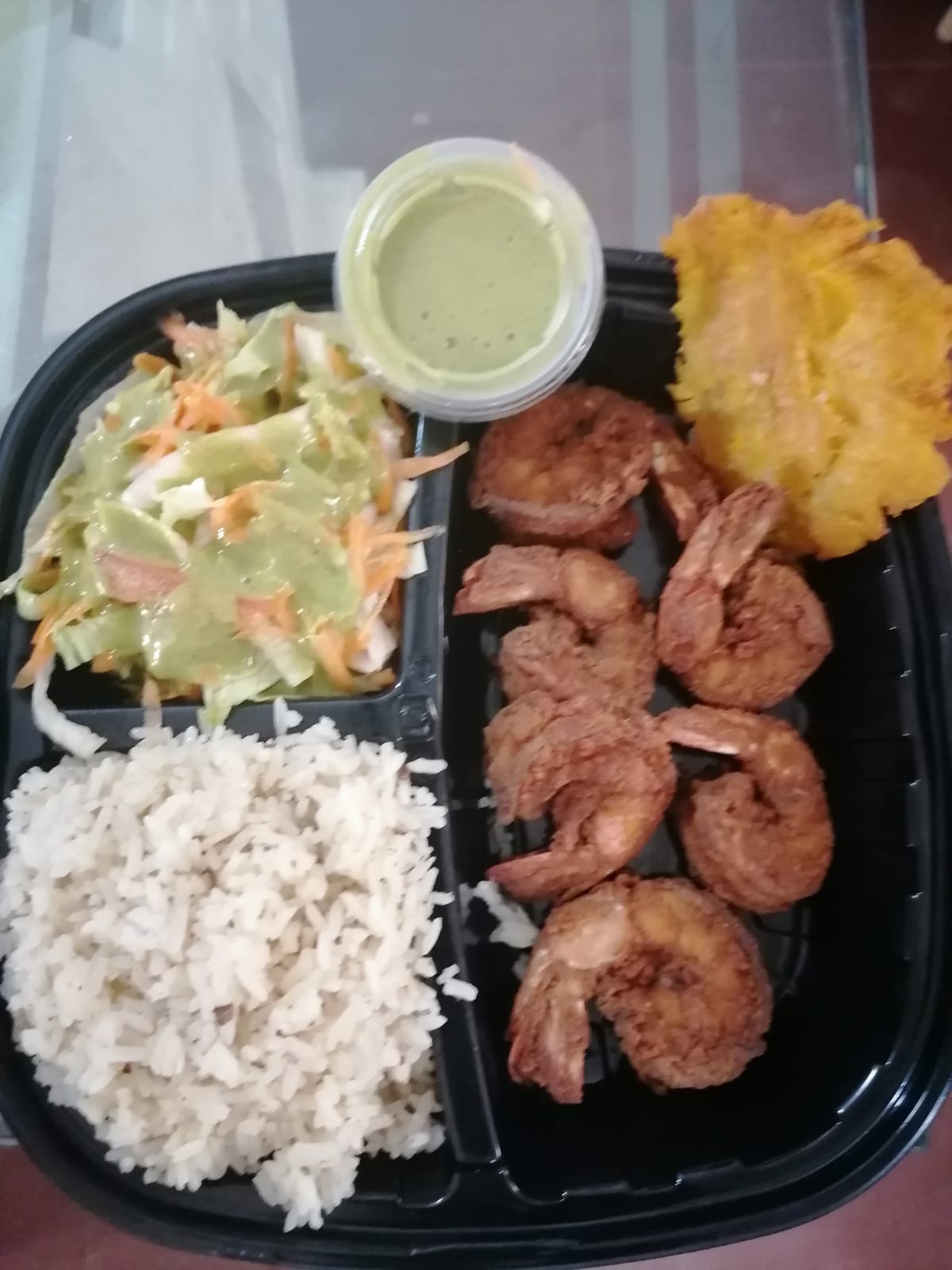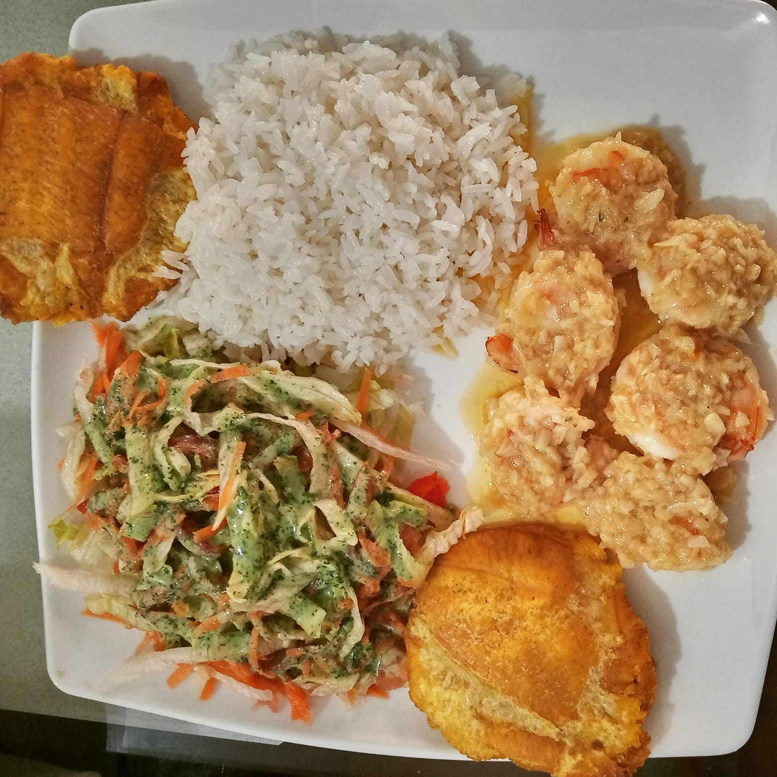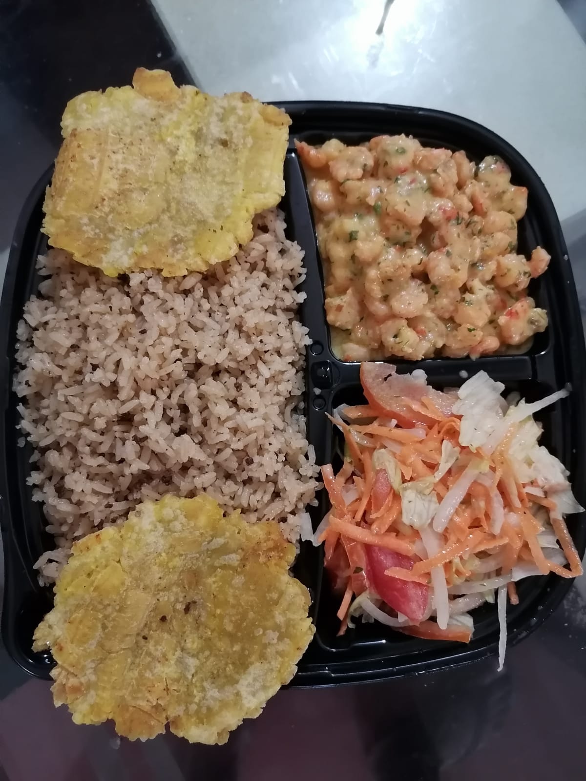 Acompañado de arroz de coco o blanco, ensalada, tostadas de plátanos.