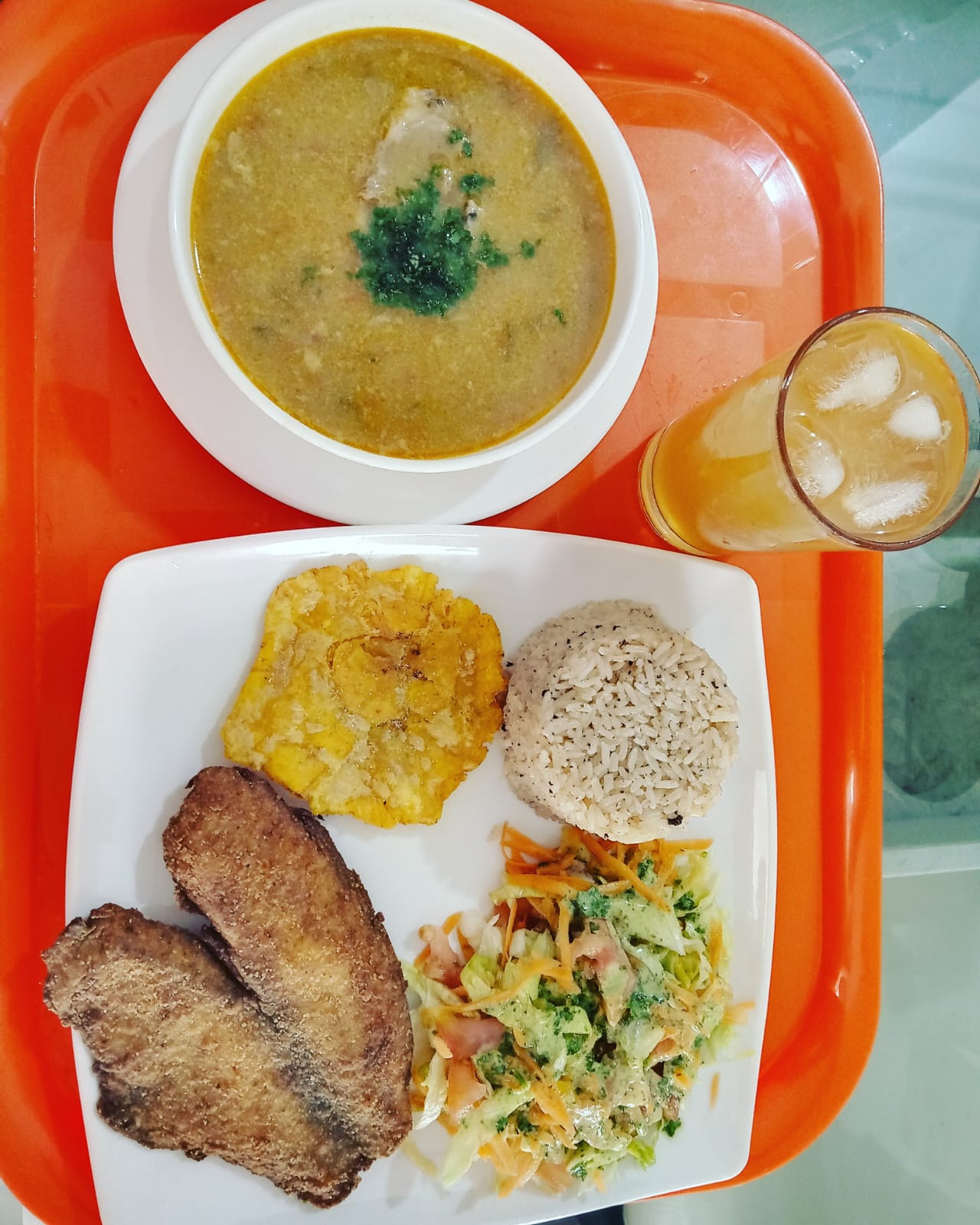 Almuerzos con Sancocho de pescado. Pescado frío acompañado de arroz de coco o blanco ensalada tostadas de plátanos y agua de panela