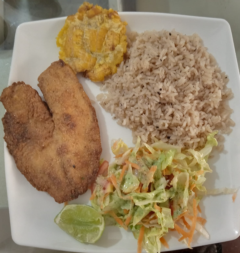 Chuleta de pescado Arroz de coco o blanco Ensalada Tostadas de plátano Jugo maracuyá piña lulo agua panela 2 empanadas de camarónes Postre
