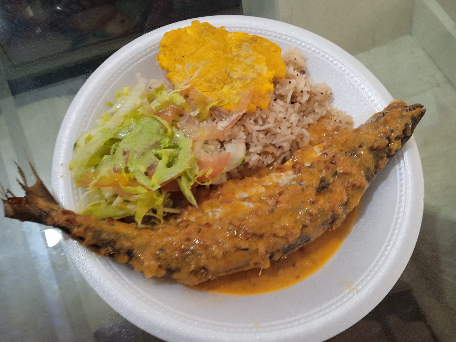 Pescado Sudado el pescado contiene 400 gramos acompañado de arroz de coco o blanco ensalada tostadas de plátanos