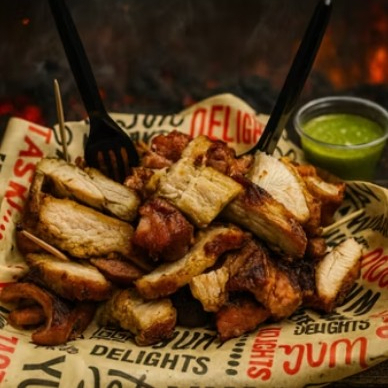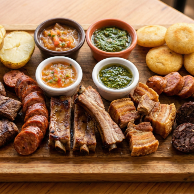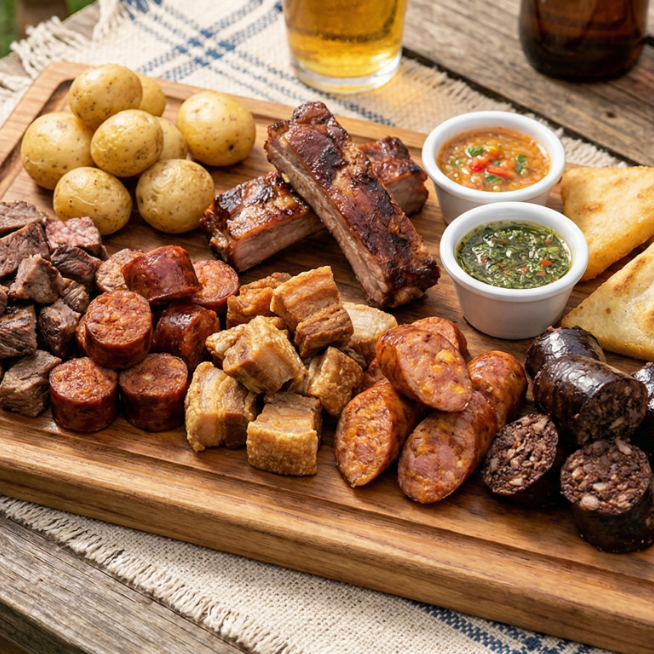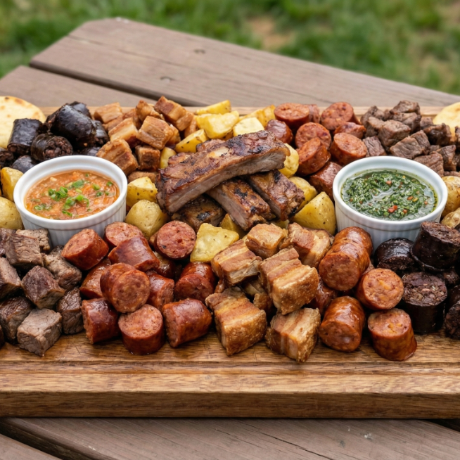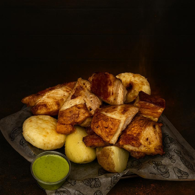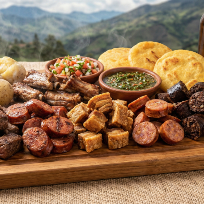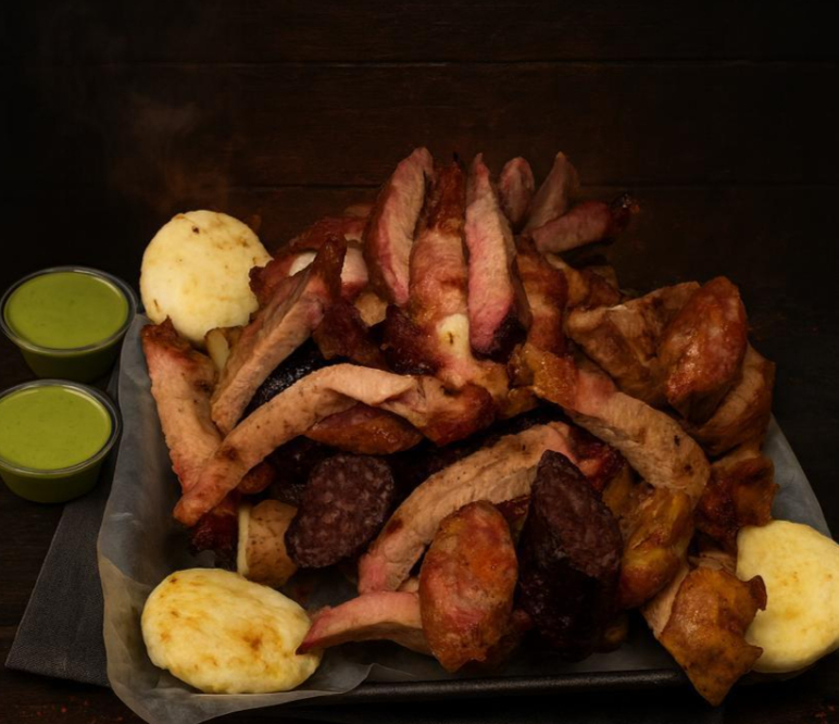 Picada para 3 con carne, chorizo de res, costilla, chicharrón, chorizo artesanal de cerdo, rellena acompañada con papa salada, arepa frita, ají, chimichurri.