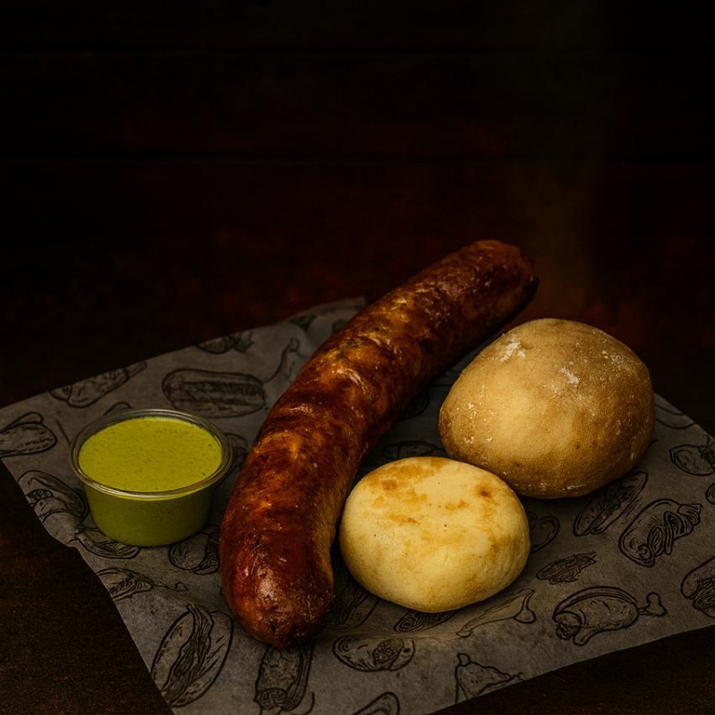 Chorizo acompañado con papa salada, arepa frita, ají, chimichurri.