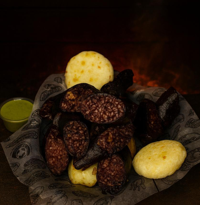 Chorizo y rellena acompañados con papa salada, arepa frita, ají, chimichurri.