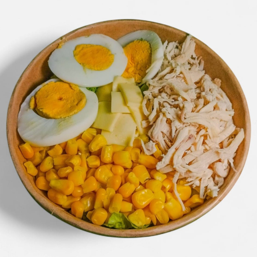 base de lechuga,pollo,maiz,huevo en laminas con tostada integral