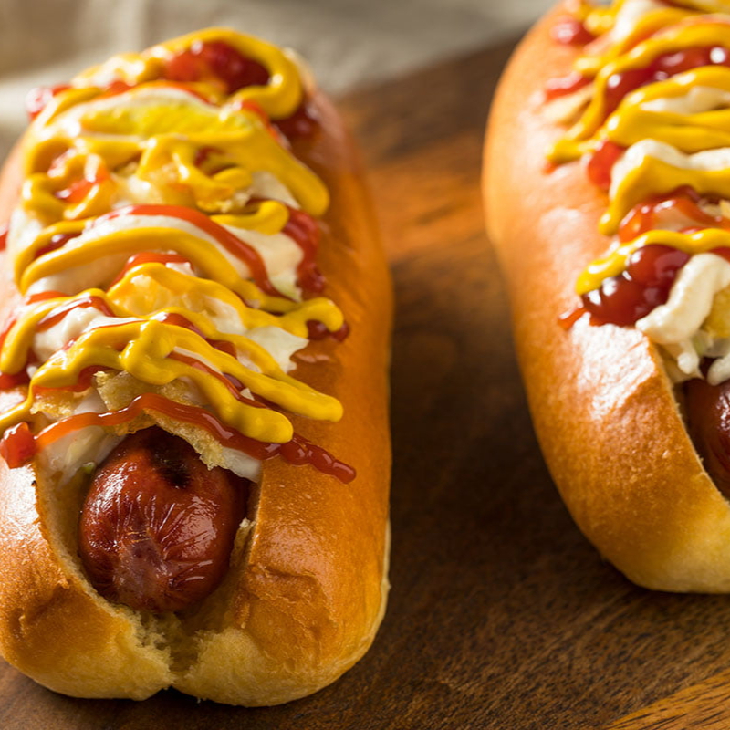 2 hot dog sencillos pan, salchicha, ripido y salsas