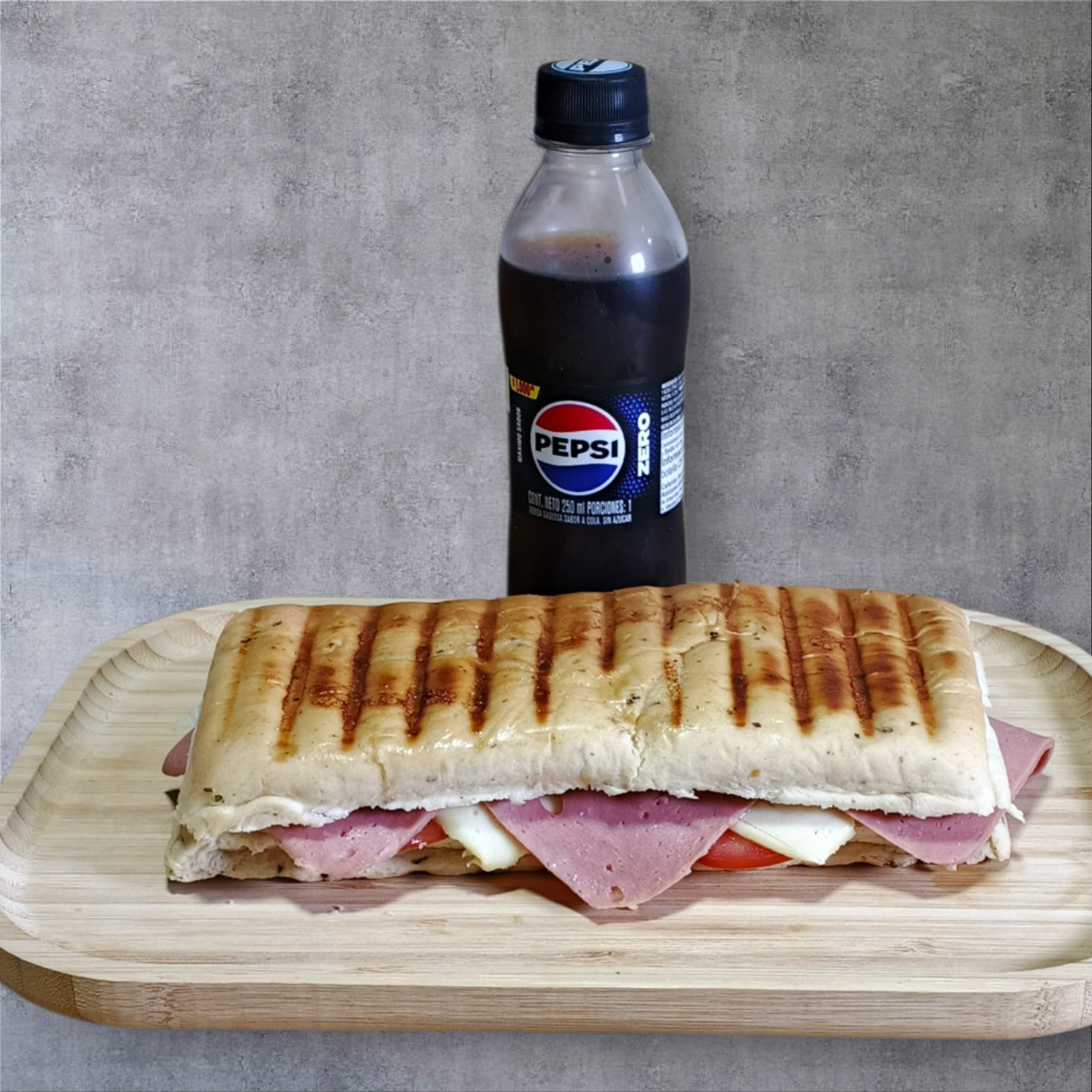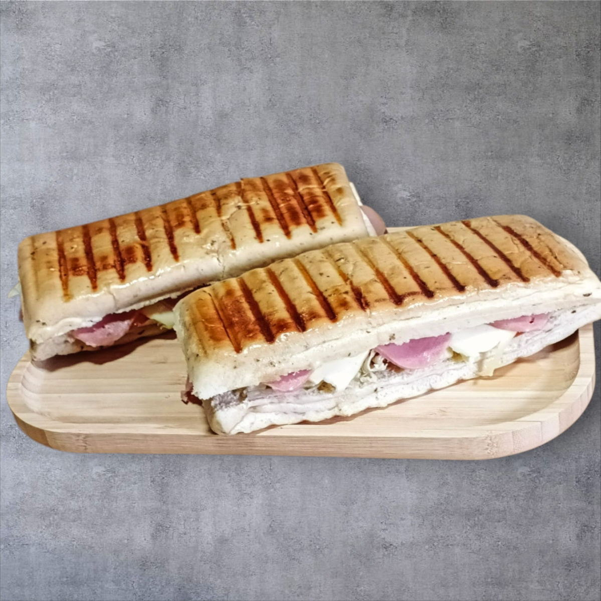 Pan de 21 cm, jamón, queso mozzarella, lechuga, tomate y salsa de ajo.