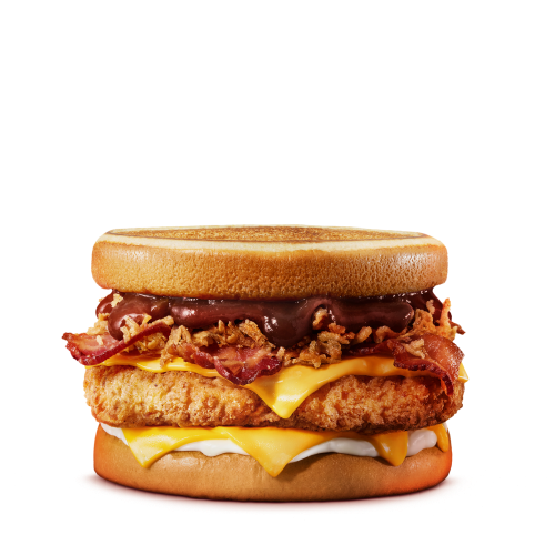 Hamburguesa con una pechuga de pollo crispy, salsa de tomate, cebolla crispy, tocineta, tres tajadas de queso cheddar y mayonesa