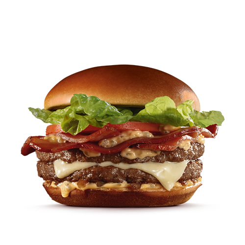 Hamburguesa con dos carnes 100% de res de 50gr c/u, tocineta y cebolla 100% colombiana, queso cheddar, salsa de tomate y mostaza.