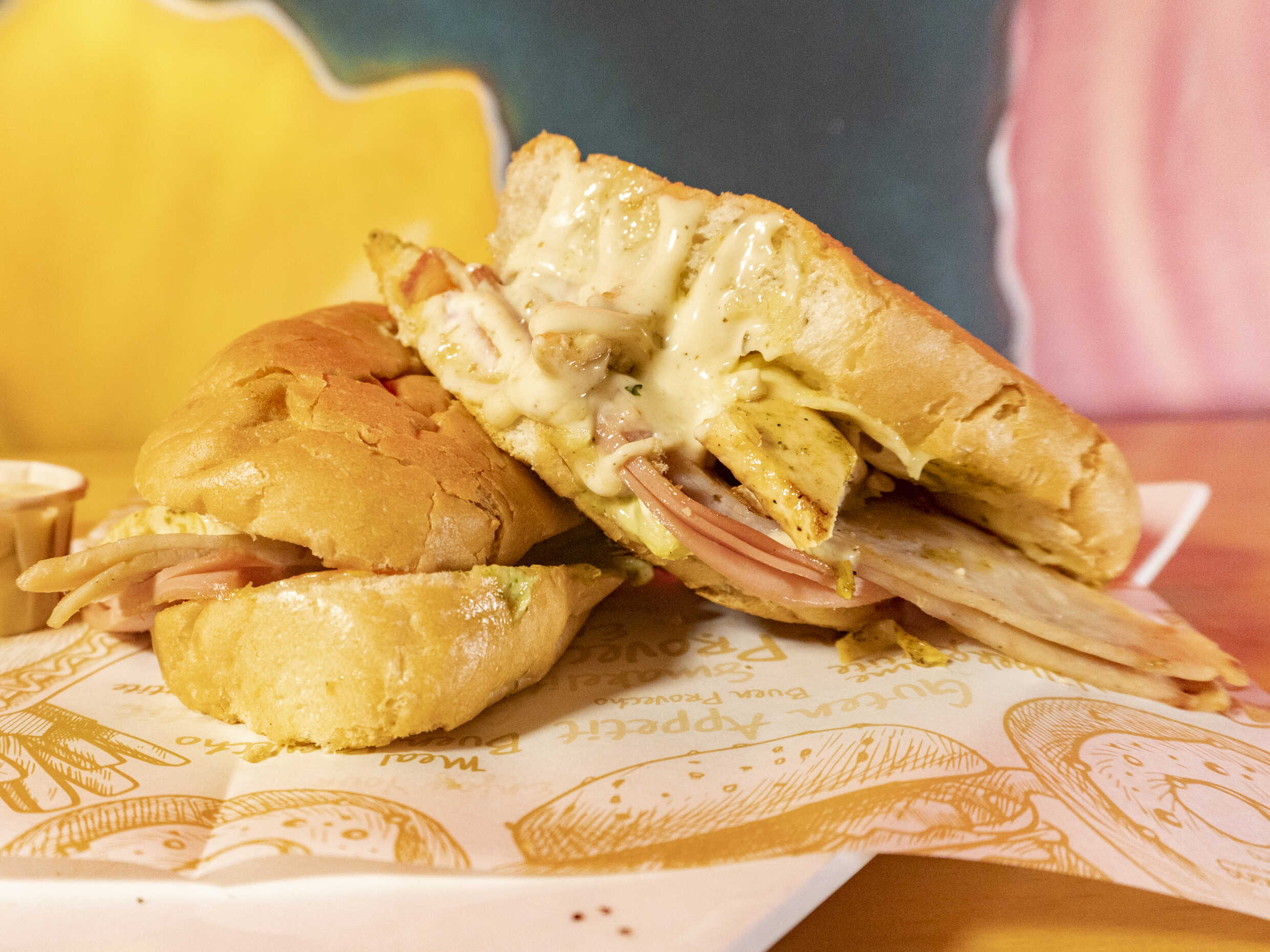 Pan francés, salami, jamón, jamón de cordero, tomate, lechuga, salsa de ajo de la casa.