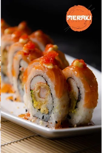 Delicioso rollo de salmón, aguacate, queso crema y palmitos, con tope de masago y ajonjolí.