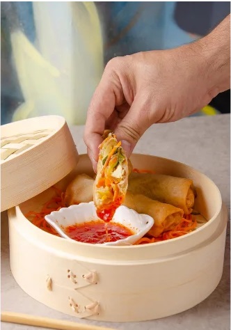3 Rollitos crocantes, rellenos de vegetales, acompañados de salsa agridulce.