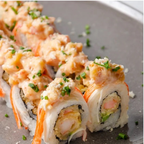 Roll crujiente de camarones panko, queso crema y aguacate, tope de kani kama y salsa mayo spicy de salmon panko, terminado en lluvia de panko y cebollin .