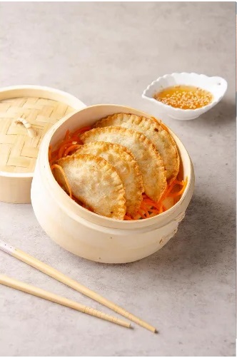4 Empanadas asiaticas.crocantes o al vapor, rellenas de vegetales, acompanñadas de salsa honey ginger