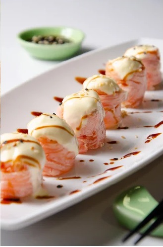 Rollitos de arroz crocante, envueltos en salmon flameado,con topping de salsa hot mayo, decorado en salsa teriyaki.