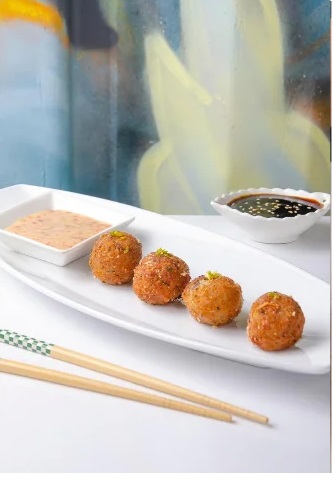 4 Crujientes esferas rellenas de camarón con mezcla de quesos, acompañadas de salsa agridulce.
