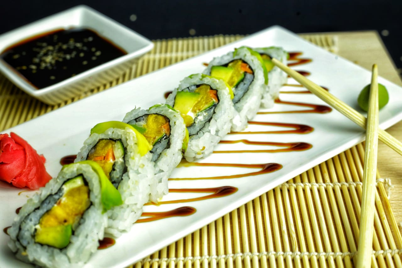 Delicioso roll de mango, zanahoria y pepino con tope de aguacate.