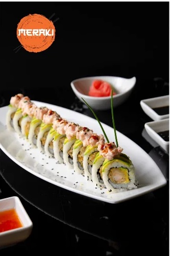 Roll de camaron panko, queso crema y tope de aguacate con aderezo de hot mayo y crunchy de pesca blanca decorado con puerros caramelizados.