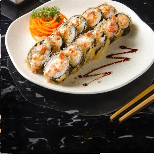 Roll tempura de langostino en parmesano, aguacate y queso crema con tope d kani kama aderezado.