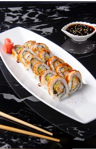 Rollo de camarón, maduro y queso crema, con tope de aguacate y explosiva salsa dinamita.