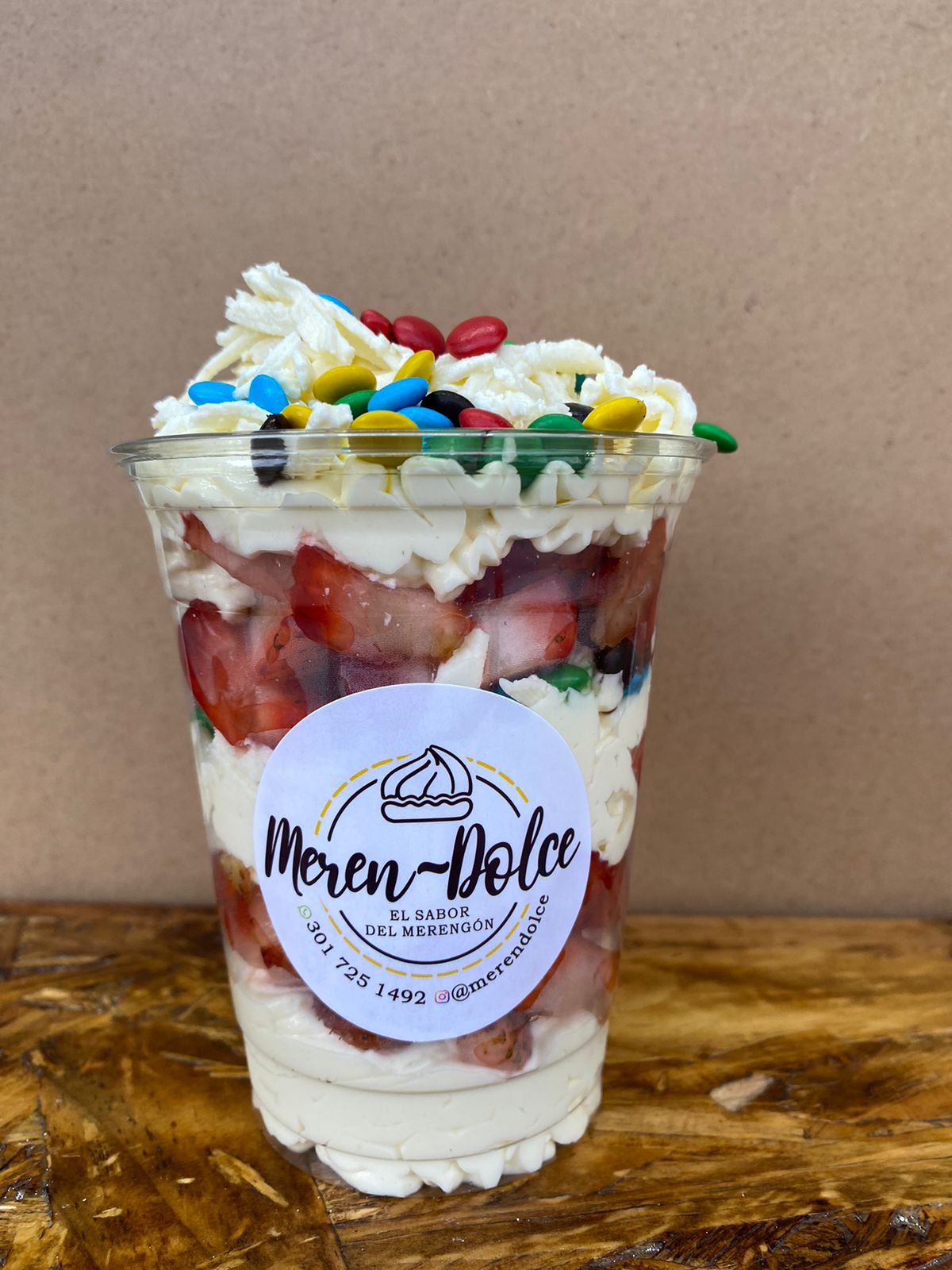 Delicioso merengón, acompañado de guanábana, fresa, Milo, crema meren dolce, suspiros crocantes, salsa de chocolate, galleta Milo.