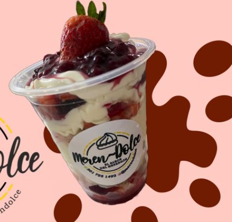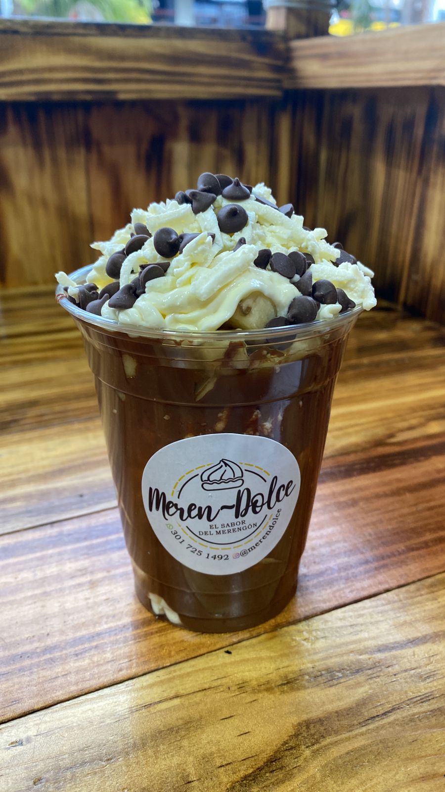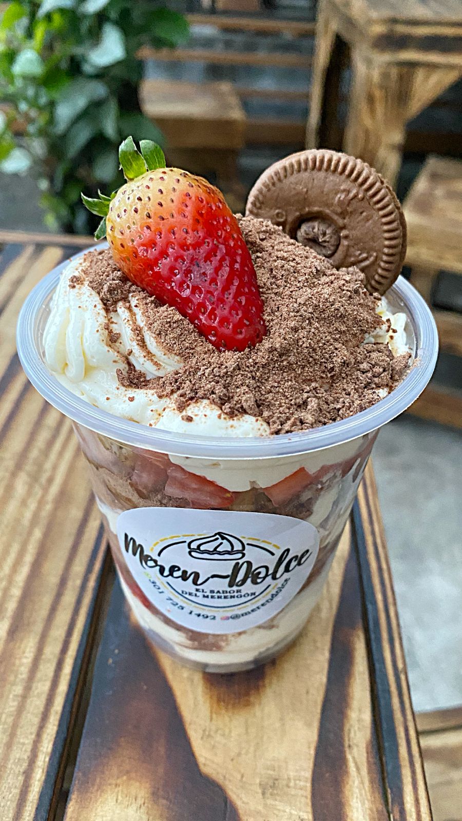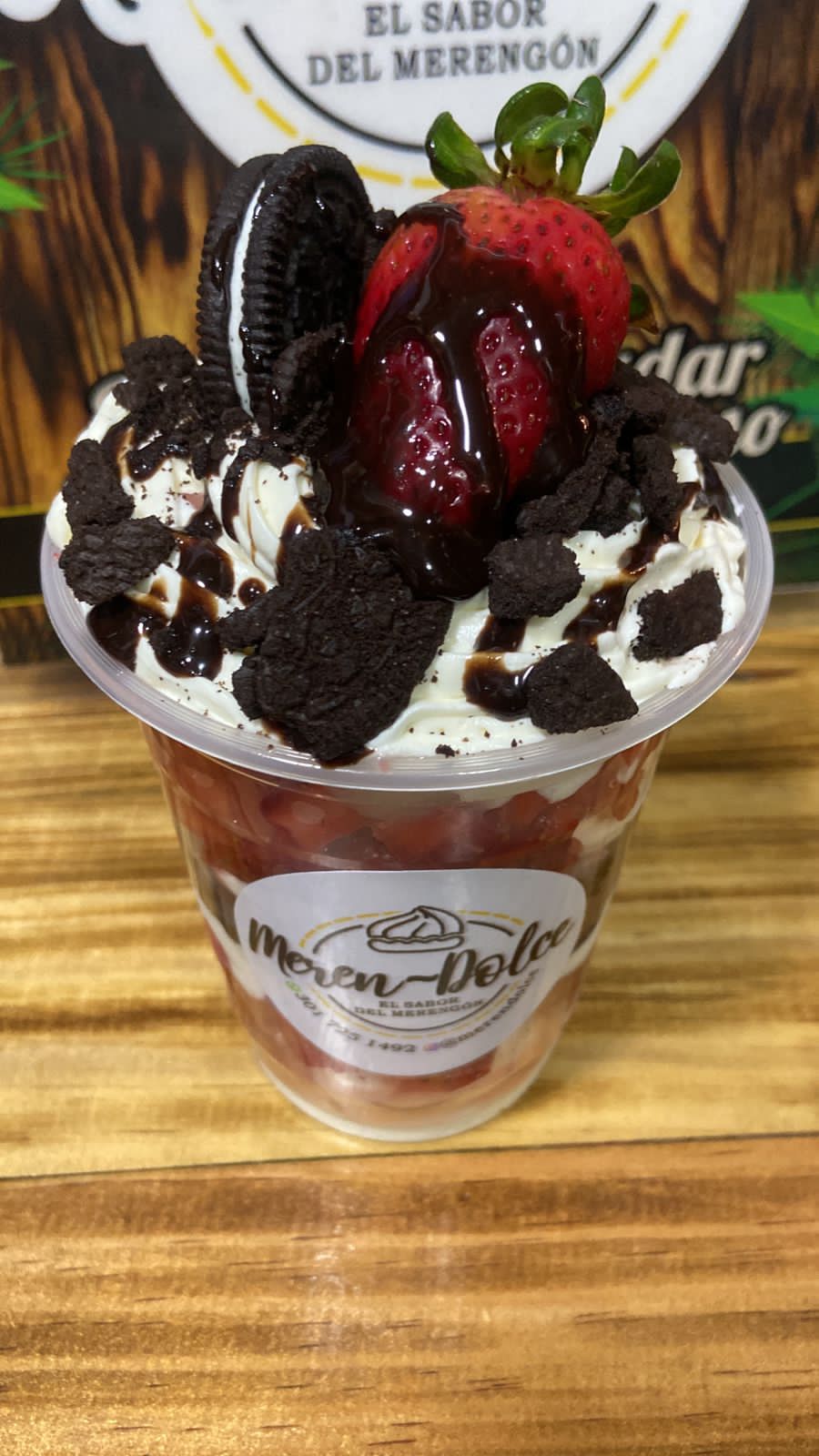 Delicioso merengón, acompañado de guanábana, fresa, Oreo picante, crema meren dolce, suspiros crocantes, salsa de chocolate, galleta Oreo.