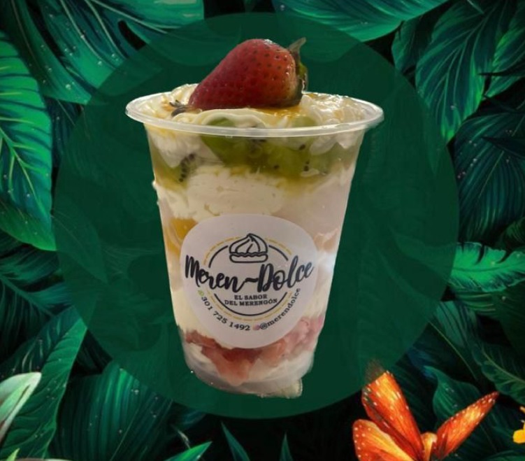 Delicioso merengón, acompañado de guanábana, fresa, kiwi, durazno, crema meren dolce, suspiros crocantes, salsa de maracuyá.