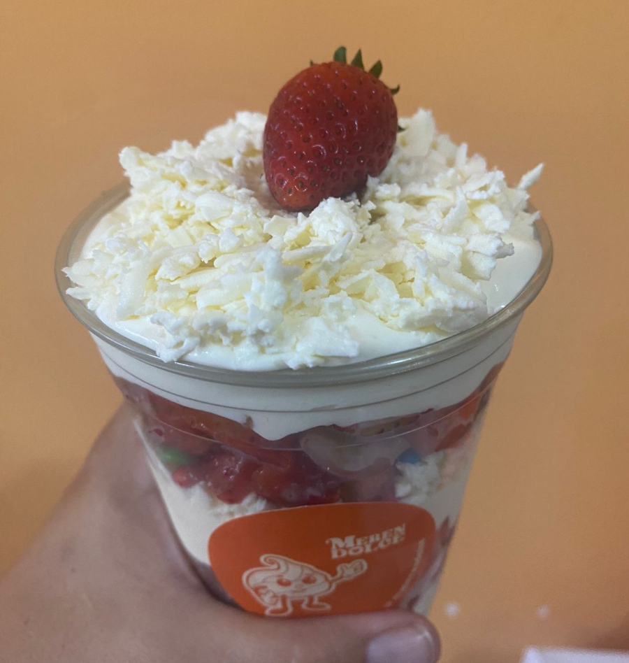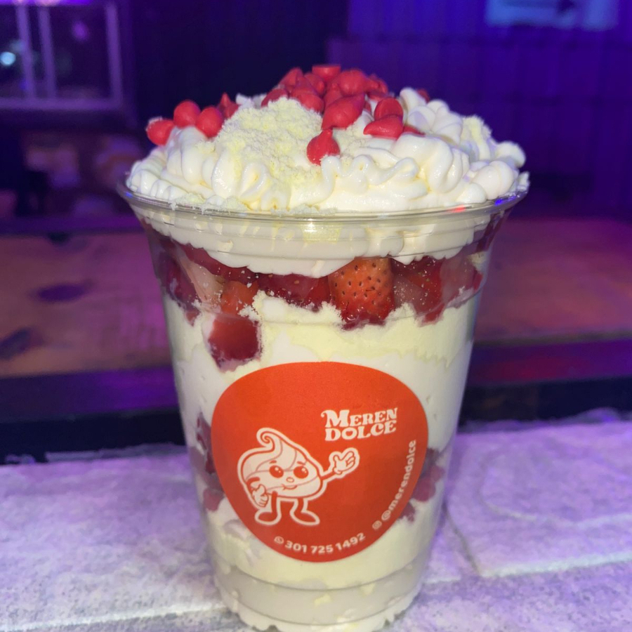 Delicioso merengón, acompañado de guanábana, fresa, Milo, crema meren dolce, suspiros crocantes, salsa de chocolate, galleta Milo.