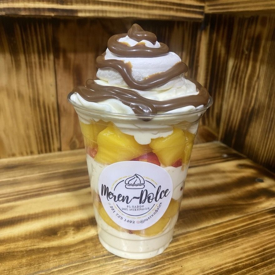Delicioso merengón, acompañado de guanábana, fresa, Oreo picante, crema meren dolce, suspiros crocantes, salsa de chocolate, galleta Oreo.