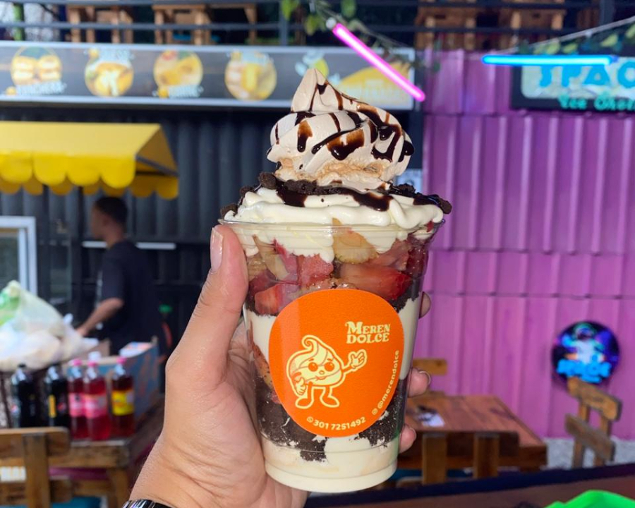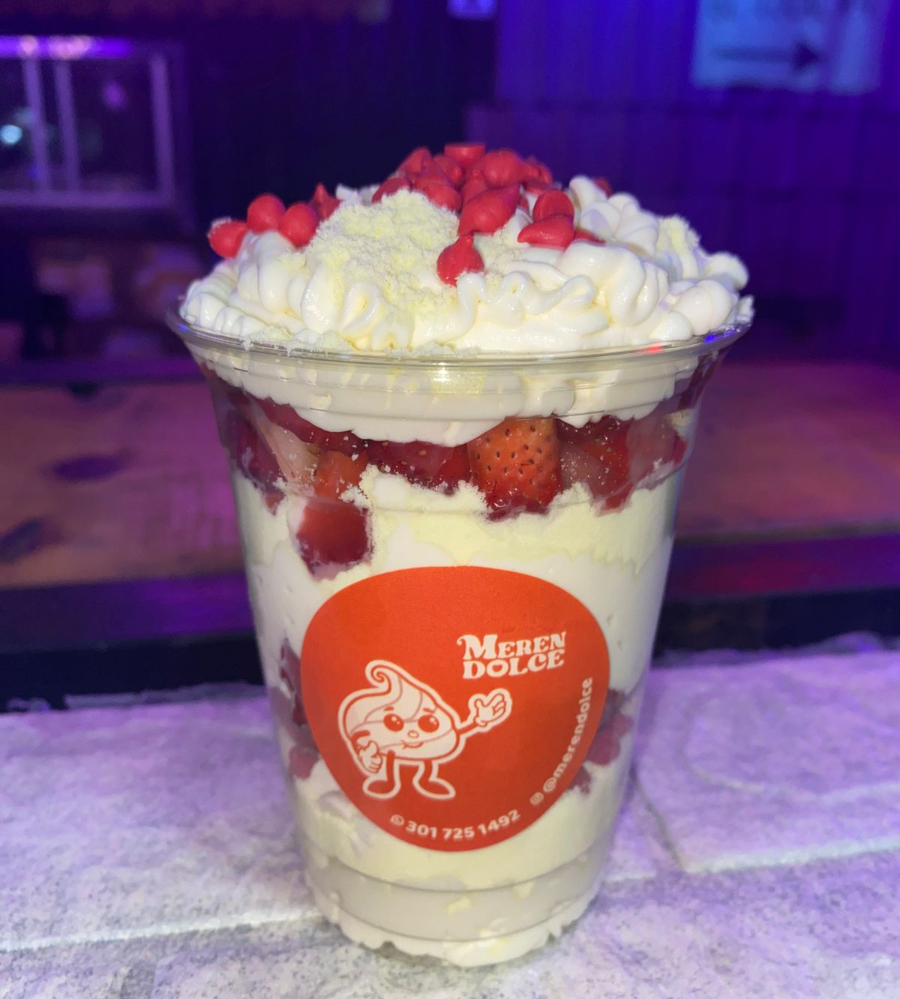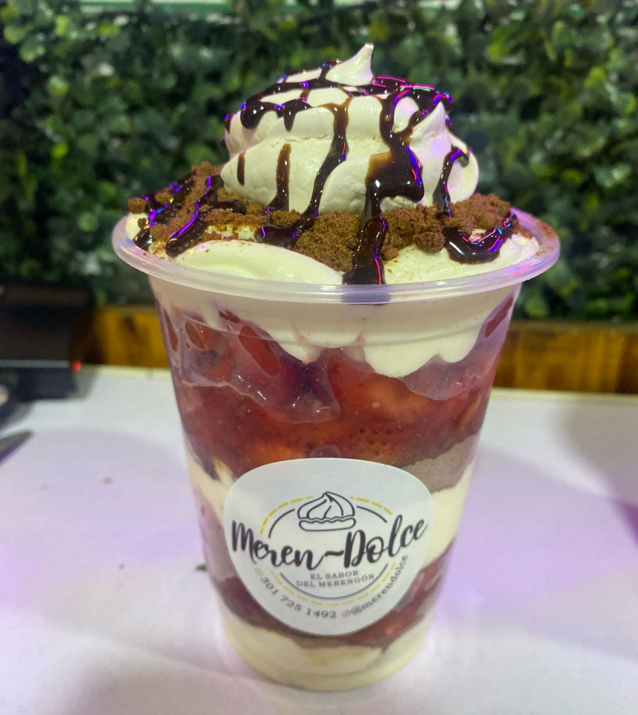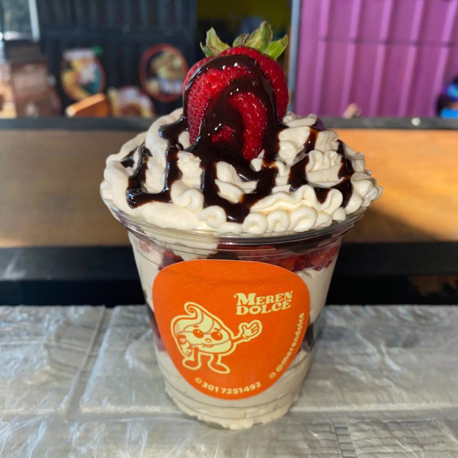Delicioso merengón acompañado de guanábana, fresa, Oreo picante, crema Meren Dolce, suspiros crocantes y salsa de chocolate y galleta Oreo.