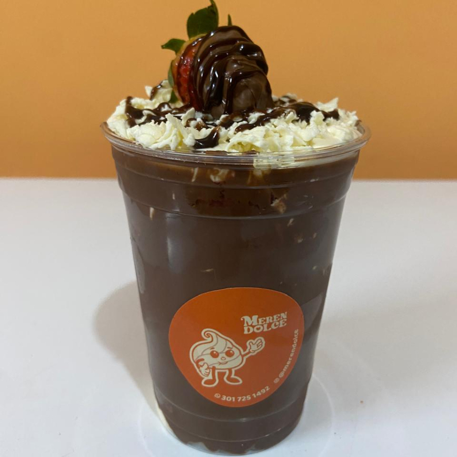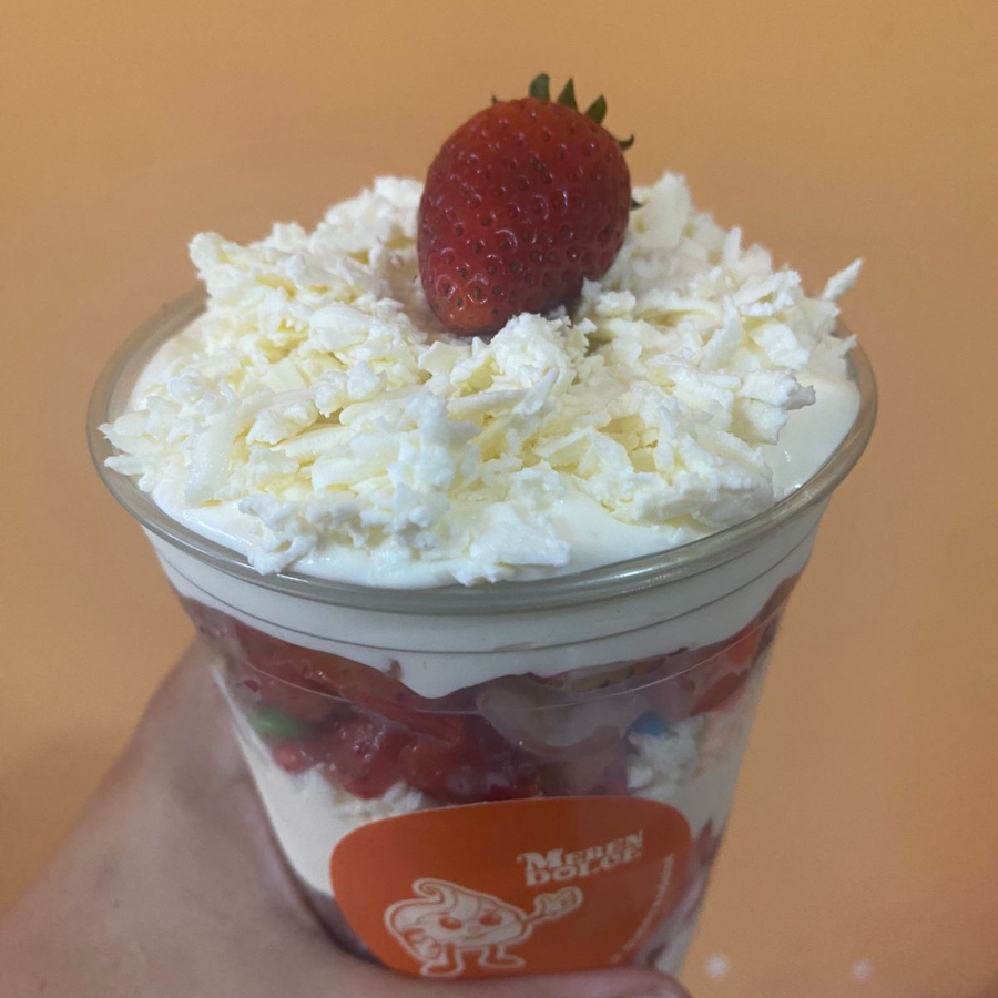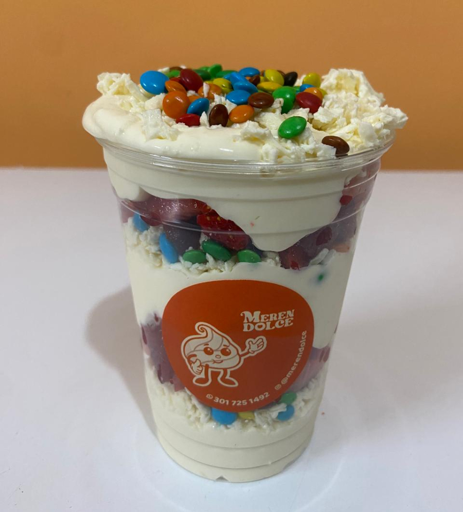 Delicioso merengón acompañado de guanábana, fresa, Milo, crema Meren Dolce, suspiros crocantes y salsa de chocolate y galleta Milo.