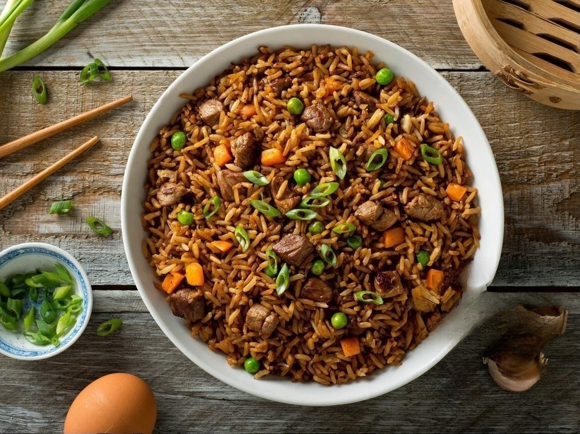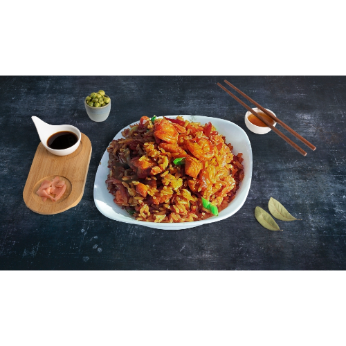 Arroz oriental con cortes de cebolla morada, pimentón, cebolla larga, habichuela, champiñón, zanahoria, pollo, cerdo, camarón, soya, sal, ajo, cilantr.