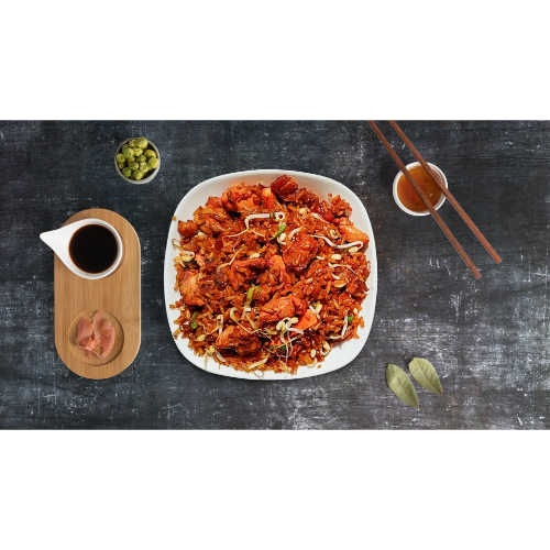 Arroz oriental con jamón, cerdo, pollo, raíces chinas, cebolla morada y tamaño a elegir.