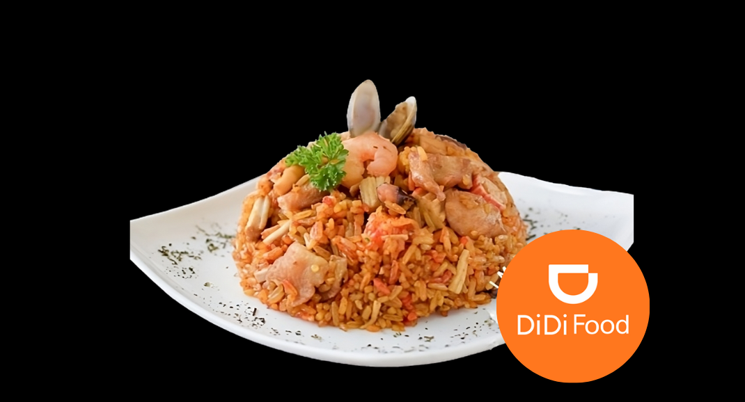 Arroz chaoufa, cebolla roja en cubos, pimentón en cubos, plátano frito en cubo, cebolla larga brócoli, calamar, 4 camarones, salsa soya.