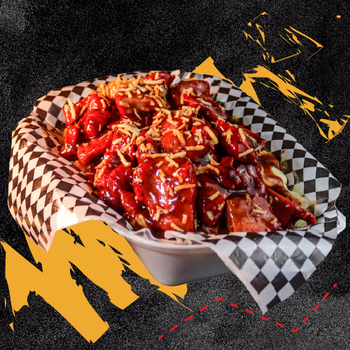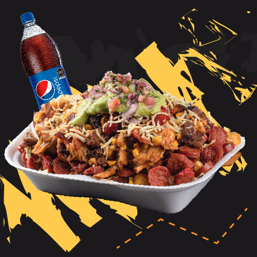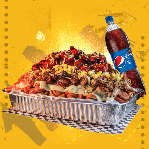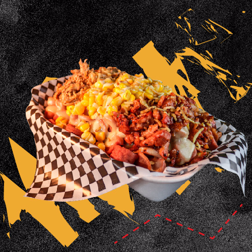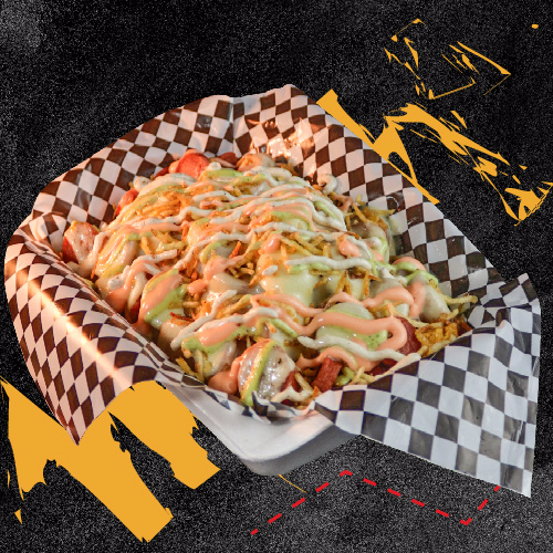 Para 2, Tocineta, Pollo desmechado, Maicitos, queso, ripio, papa, salchicha y salsas de la casa.