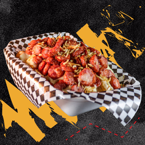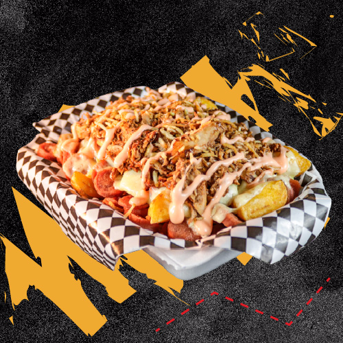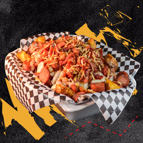 Para 2 Papa amarilla, salchicha, queso americano gratinado, ripio de papa y salsas caseras.