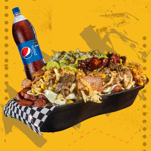 Para 3 a 4, Carne Burger, Tocineta, Pollo desmechado, maicito, costilla ahumada con salsa bbq, queso, ripio y salsas de la casa